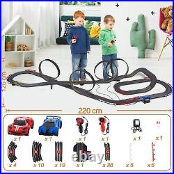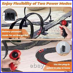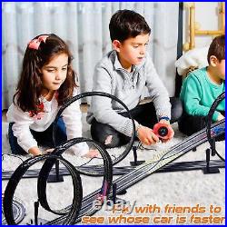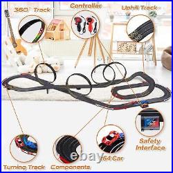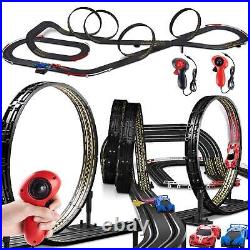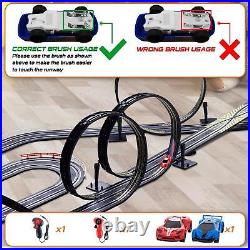 36.5 Ft Track Length Slot Car Race Track? : With 4 speed track loops, one slope corner, one fly-over, two lane changers, about 36.5 feet of high-speed track length, and 2 R/C race slot cars with LED lights. The race set includes different layout options to provide endless amounts of fun and variety, can change the layout in a matter of minutes with the easy-to-connect track for even more racing excitement. : You feel the power and speed of the 1:64 scale size cars racing on the track measuring over 36 feet and reaching scale speeds of 370 mph! Cars have built-in LEDs that glow at high speed, bringing you the most fantastic racing experience ever.