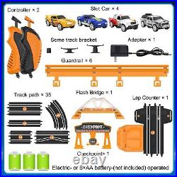 Slot Car Race Track Set Electric Powered Race Track Dual Racing Car Track Set US. Cool Design Toy Race Track: The slot car race track sets truly restores all kinds of racing tracks, including simple straight track, curved track, 360°circular track, exciting two-lane track, it's a great race track toys for kids age 4 5 6 7 8 9 10 11 12. Realistic Racing Experience: Race track has an automatic lap counting function, recording race situation in real time, to make the racing more realistic, we added LED flash bridge, impact pendulum on the track, giving racers a more interesting experience. High-Speed Stimulating Racing Car Track: The 18ft electric race car track with 1:64 scale race car can reach a speed of about 300-370 mph on the electric track; the boy race track set has two power modes, electric or 6 x AA battery(not included). Creating Wonderful Kids' Memories: The toy slot car track is car games for two Players that family, friends both kids and adults will enjoy; two-person racing track set can accompany kids, spend a happy parent-child time, remaining wonderful memories. Easy to Install & Control Electric Track: The rc tracks for boys 4-7 have a better system to lock into place and easy to put together; controllers allow the driver to choose slow or fast speed control to improve the driver's experience. Magnetism Design Stabilizes Racecar: In order to keep car on the track better, we have enhanced the magnetism, but it's also important to control speed, remember to slow down when turning; in addition to we prepare extra brushes on the bottom of the car. Ideal Gifts for Kids: Made of high quality and durable materials, it is a good choice gifts for kids on Easter, Xmas, All Hallows' Day, Thanksgiving Day, New Year, etc, it is a prefect gift for boys girls 4-7 8-12 years old on birthday and holiday.
