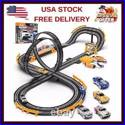 Slot Car Race Track Sets with 4 Slot Cars, Electric Race Car Track Include Slope Circular Overpass Track, Dual Racing Game Featuring Flash Bridge and Pendulum, Gifts Toys for Boys Kids Age 6 7 8-12. Featured Racing Tracks: Our slot car race track sets have more featured tracks, including simple straight tracks curves tracks, U-shaped slope tracks and exciting 360° circular staggered tracks, and automatic lap counting function also bring the coolest racing experience to the racers. At the same time, our kids racing track toy has two power modes, electric or 6xAA battery(not included), so that your kids can enjoy the fun of racing at outdoor party. Fond Memories of Childhood: Our race car track for boys age 4-7 8-12 is car toy for two racers, you can compete with your child, which can remind you of the joy of your childhood when slot cars was popular. To make the racing game more realistic, we added LED flash bridge and impact pendulum on the racetrack, a great alternative to video games.