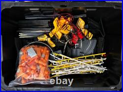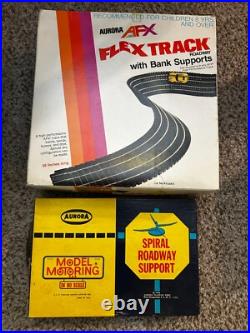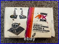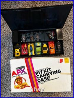 27 gallon tote full of vintage Aurora slot car tracks, controllers, guard rails, trestles etc. Also included are vintage boxes as shown and Pit Kit carrying case with six car bodies and 4 chassis. Not all pieces of start/finish pylons are in the box.